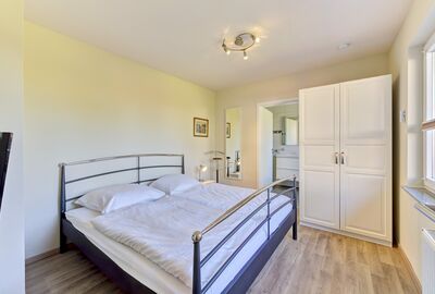 Das Schlafzimmer ist mit Doppelbett (180 × 200 cm), Kleiderschrank und 32-Zoll-SAT-TV