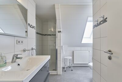Das Badezimmer ist modern ausgestattet mit Dusche, WC und Föhn – für einen frischen Start in den Tag.